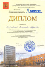 | четверо докладчиков: КЛИМАЙ Пётр Александрович, ГАВРИЛОВ Сергей Александрович, ЗЯБЛОВСКИЙ Александр Андреевич, ДЕНИСОВ Андрей Николаевич, ПОЛЕЩУК Роман Владимирович удостоены дипломов МФТИ победителей конкурса научно-исследовательских работ студентов и аспирантов на конфренции "Современные проблемы фундаментальных и прикладных наук" , а первые двое награждены также ценными подарками - флеш-картами "За высокое качество презентации" | ![]() |
